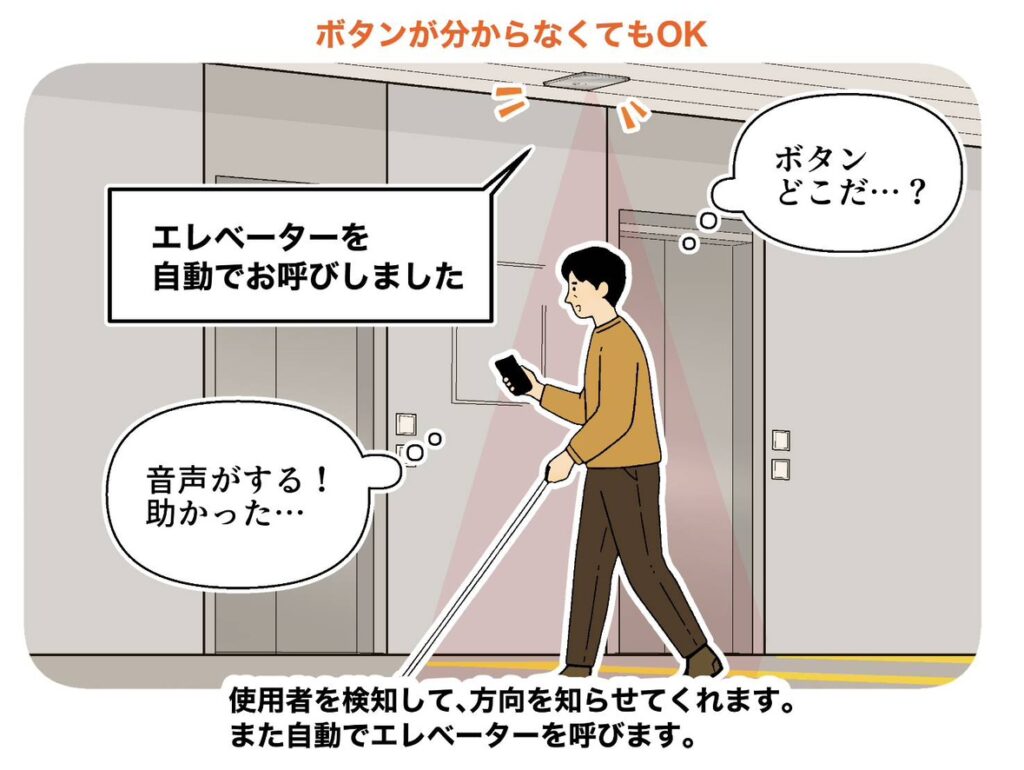 ボタンを押すことなくエレベーターを呼び出し、目的階へ移動するシステムです。
