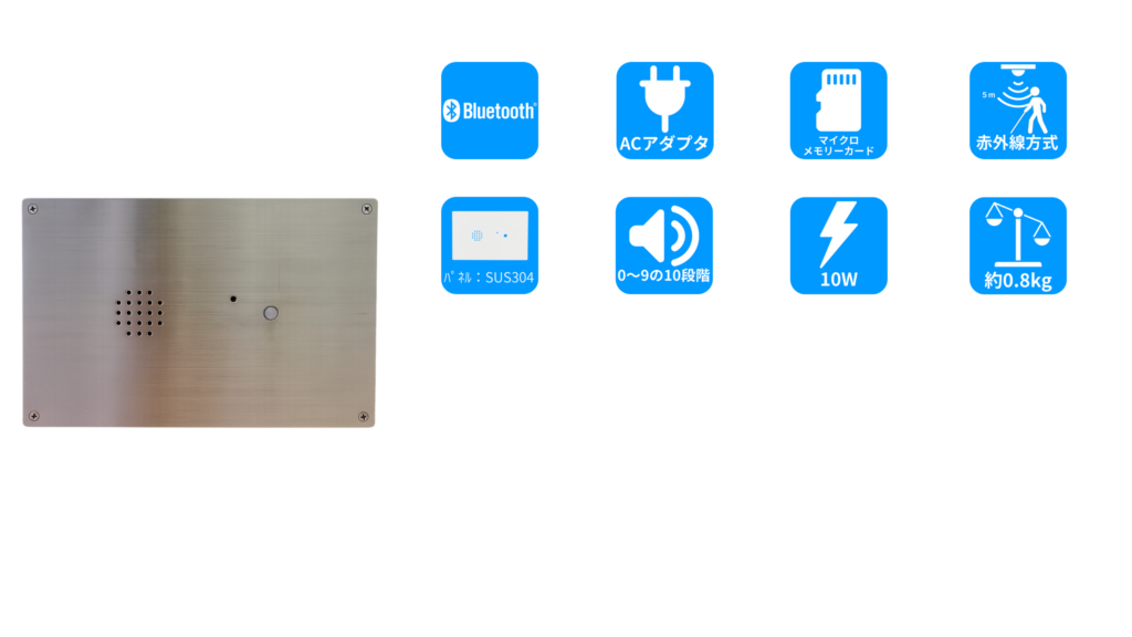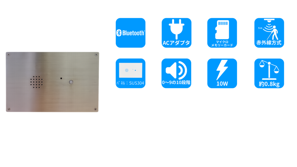 Bluetooth®信号反応音としては、①盲動鈴などの誘導チャイム もしくは ②男女別(日本語)と言語別の反応音を設定出来ます。